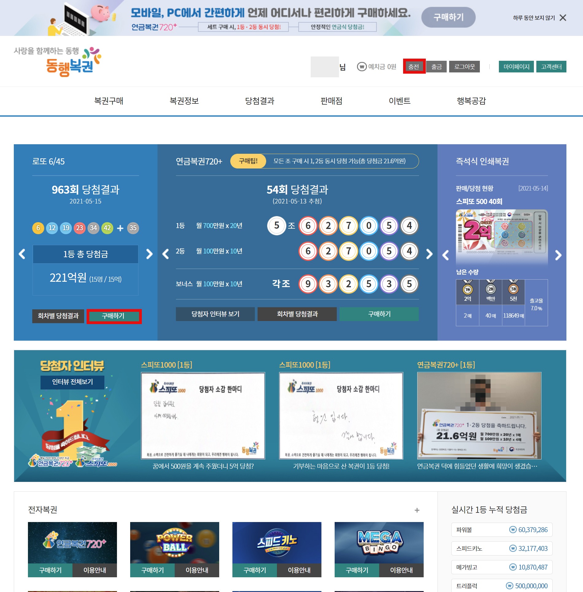 3. 동행복권 홈페이지에서 로또 6/45, 연금복권 720+, 그 외 즉석 복권 게임들을 구입합니다.