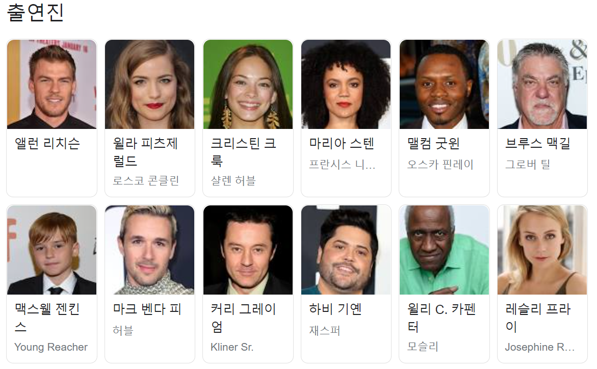 주연은 아래 이미지에 나오는대로 입니다. 톰 크루즈의 잭 리처를 생각했다가 주연을 맡은 앨런 리치슨의 키가 매우 큰 근육질의 리처를 보니 또 색다르게 다가왔습니다.